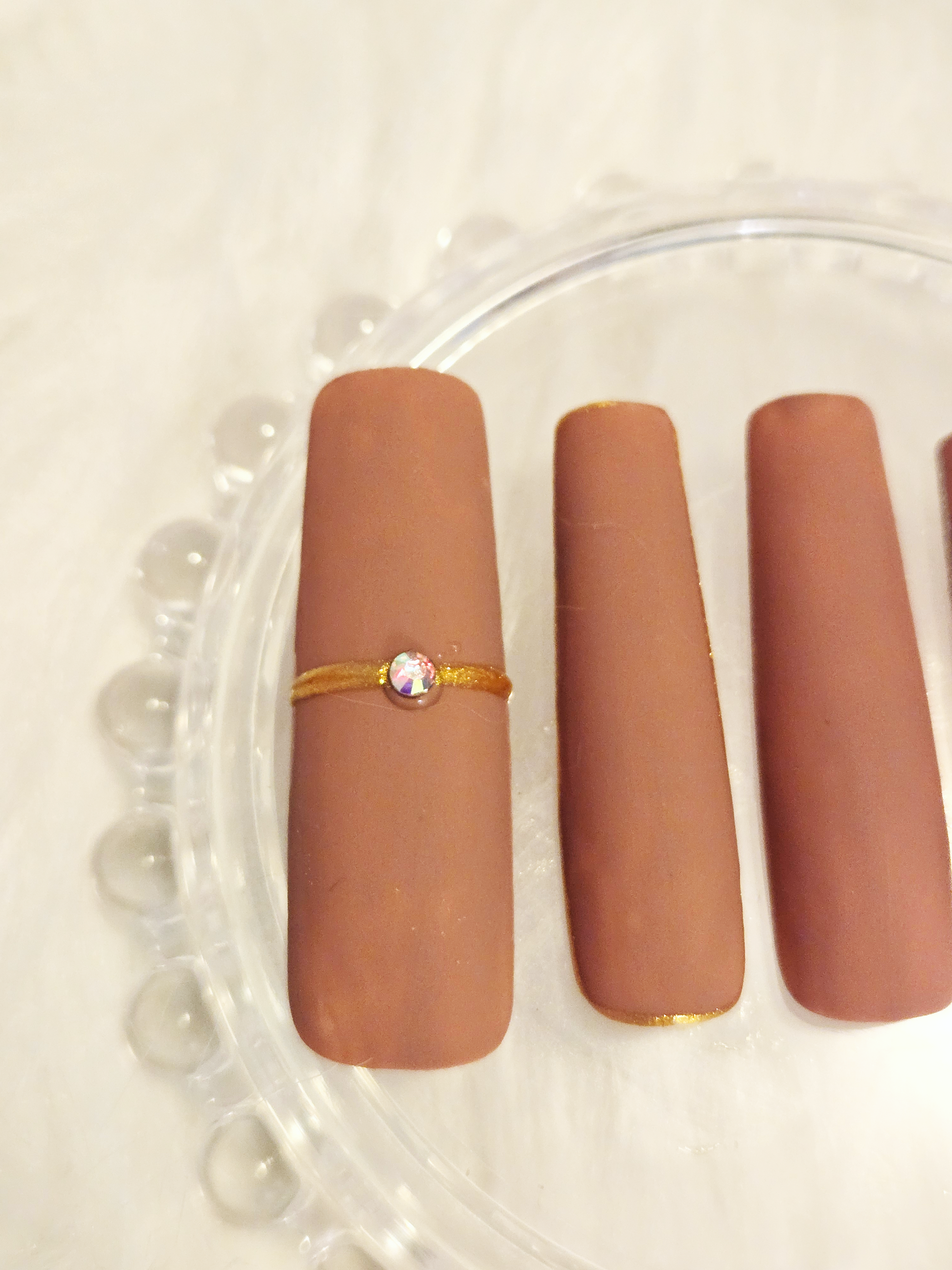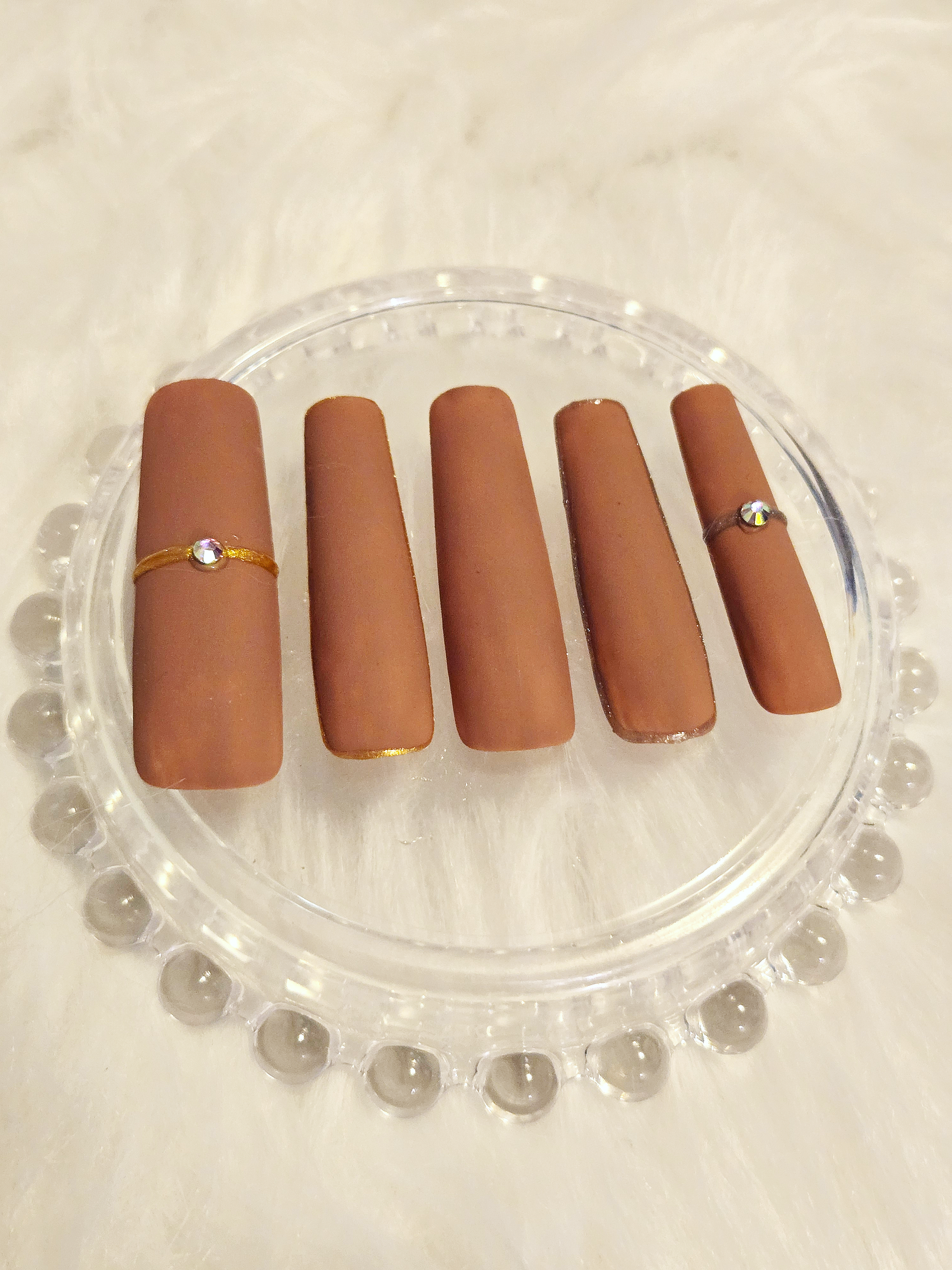 Indulge in regal elegance with Mocha Majesty, a handcrafted press-on nail set that blends rich matte brown tones with shimmering gold accents and sparkling diamanté details. This design evokes warmth, sophistication, and a touch of glamour — perfect for evening events, fall fashion, or everyday luxury.